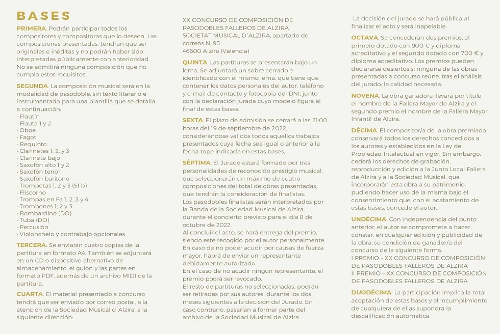 S'han publicat les bases d'aquest concurs d'àmbit nacional, que va nàixer a l'any 2000 i que va significar que les Falleres Majors de la nostra ciutat des de l'any 2002 tinguen un pasdoble amb el seu nom.