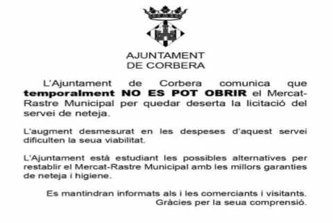 L’Ajuntament de Corbera informa que temporalment NO ES POT OBRIR el Mercat- Rastre Municipal per quedar deserta la licitació del servei de neteja.