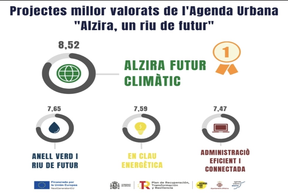 1. Alzira futur climàtic. El projecte millor valorat pretén integrar la gestió de cadascun dels riscos associats al canvi climàtic de manera efectiva i coordinada entre els agents implicats, minimitzant-los i donant resposta a les emergències que esdevinguen tant en les zones urbanes com de les zones naturals del municipi per a fer front a la degradació dels recursos naturals.