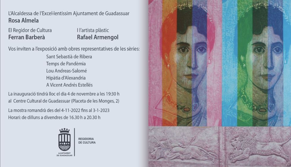 L’Ajuntament de Guadassuar, per mitjà de la Regidoria de Cultura, ha preparat junt amb l’artista plàstic Rafael Armengol una exposició de les seues obres més representatives de les sèries “Sant Sebastià de Ribera”, “Temps de pandèmia”, “Lou Andreas-Salomé”, “Hipàtia d’Alexandria” i “A Vicent Andrés Estellés”.