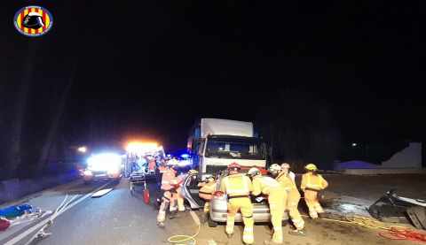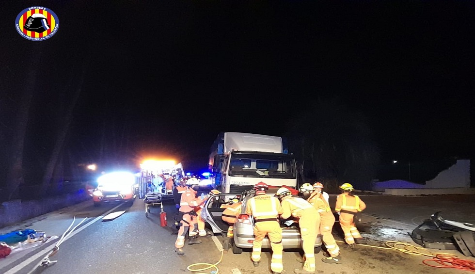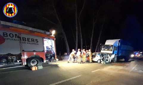 A les 19:20 hores hem rebut avís d’un xoc entre un camió i un turisme, i s’hi han mobilitzat a la zona dotacions de bombers de Gandia i Alzira, sergent d’Alzira i GERA. Han hagut d’excarcerar la conductora del turisme, que havia resultat atrapada a conseqüència del fort impacte.