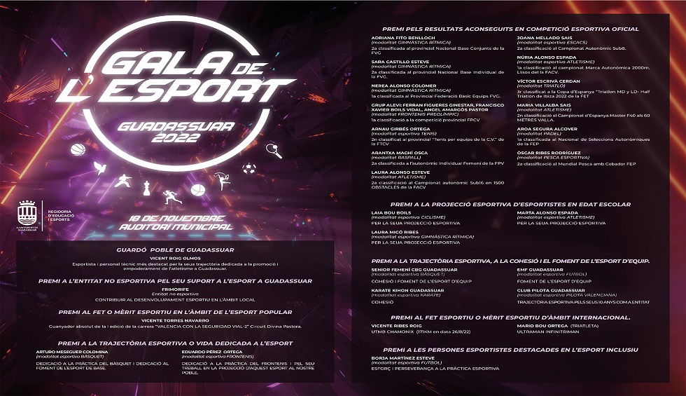 L’Ajuntament de Guadassuar, des de la Regidoria d’Esports i el Consell Municipal d’Esports, ha organitzat la II Gala de l’Esport amb l’objectiu de premiar a tots i totes les esportistes de la localitat que han aconseguit algun èxit important durant la present temporada. L’acte tindrà lloc el pròxim divendres, 18 de novembre, a l’Auditori Municipal de Guadassuar a partir de les 20.00 h. D’esta manera, es busca consolidar una gala esportiva que va haver-se de parar durant l’any de la pandèmia, però que, després de l’èxit de la primera, torna amb força per a seguir fomentant l’esport entre el veïnat de Guadassuar.