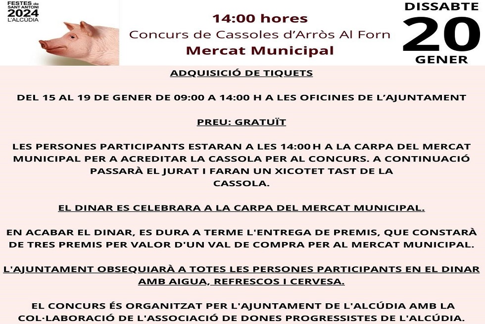 - El pròxim dissabte, 20 de gener, celebrarem el concurs de cassoles d'arròs al forn a la Carpa del Mercat Municipal a les 14:00 h. Activitat programada dins de la Festivitat de Sant Antoni 2024.