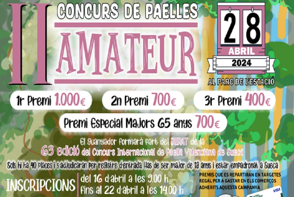 El II Concurs de Paelles Amateur se celebrarà el pròxim diumenge 28 d'abril al Parc de l'Estació, i igual que en el Concurs Internacional de Paella Valenciana de Sueca, i gràcies a les empreses patrocinadores que donaran els seus productes per a la cocció, els 40 participants comptaran amb els mateixos ingredients per a cuinar la paella seguint la recepta oficial del certamen internacional. Els i les participants hauran d'estar empadronats a Sueca i ser majors de 18 anys. A les 11 hores està previst l'inici del concurs.