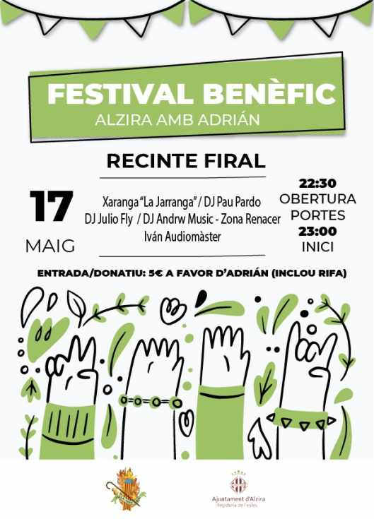 Divendres a la nit, la Regidoria de Festes i la falla Sant Roc, d'on és faller Adrián Fernández, han organitzat un festival benèfic. Amb el donatiu/entrada de 5€, participes en la rifa de diversos lots d'obsequis de La Fúmiga, Estan de Benimuslem i Moretó Alzira. Tota la recaptació del concert l'ingressarà íntegrament la Junta Local Fallera d'Alzira.