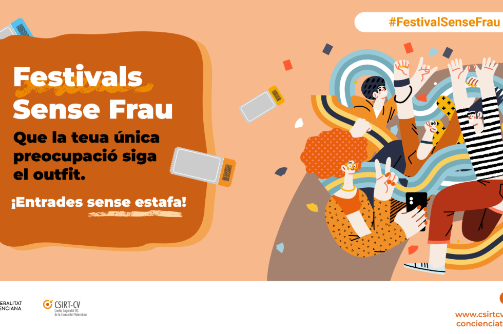 Amb el lema #FestivalsSenseFraus. Que la teua única preocupació siga l’outfit. Entrades sense estafa!, CSIRT-CV publicarà les seues recomanacions fins al pròxim 30 de juny, tant en els seus perfils de xarxes socials en X i Facebook, com en el portal especialitzat en conscienciació (concienciat.gva.es).